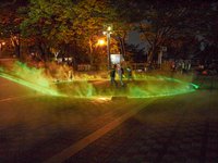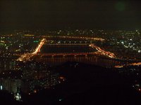 Namsan, the "South Mountain", is a mountain inside the city of Seoul, but south of the historical center. You can access it from Myeong-Dong, the central shopping district near Namdaemun gate. There is a cable car leading up the mountain, and on the top, you find N-Seoul tower, a telecommunications tower. There are restaurants and other facilities around, and there are light shows and artistic displays. The view from the tower observation deck is great, but the window panes are dirty and full of reflections from the interior lighting